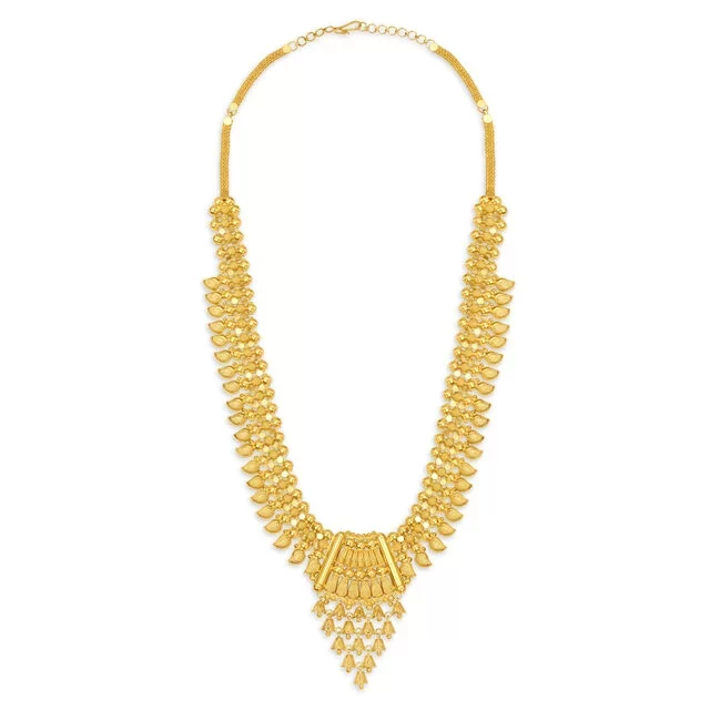 A long, divine gold necklace inspired by the Goddess Sita, featuring layered chains and a central medallion. The Bengali Sita Haar design stands as a symbol of prosperity and heritage, worn on both wedding and reception days. Layer it with a Bengali choker design in gold piece for a regal bridal silhouette.