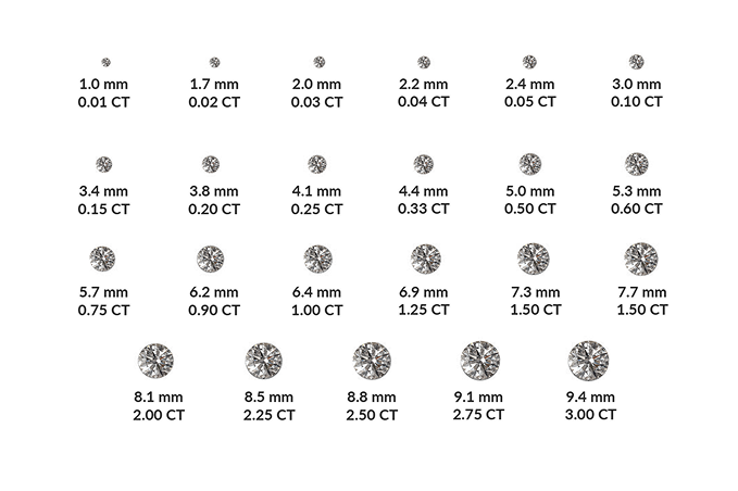 Carat weight: Carat (with a “C”) is a measure of the weight for precious stones. One carat equals 0.20 grams. When relating to the size of round diamonds, the dimension measured to establish a size to weight ratio is the diameter of the diamond.