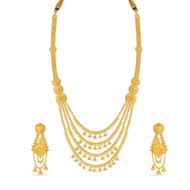 Every woman deserves a Rani Haar moment. The Exquisite Tiered Gold Rani Haar isn’t just a necklace, it’s a statement, a legacy, and a little bit of theatre. Whether you’re leading the puja at home or making an entrance at a festive gathering, this piece commands attention most effortlessly. Its cascading layers of gold are designed for women who own their presence, who carry tradition with modern grace.