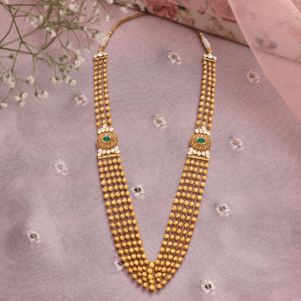 The couple takes seven steps together, taking sacred vows representing their shared journey of life. The Stately Layered Rani Haram is an exquisite ornament that perfectly adorns the bride during this final and significant ritual, epitomising grace and tradition.