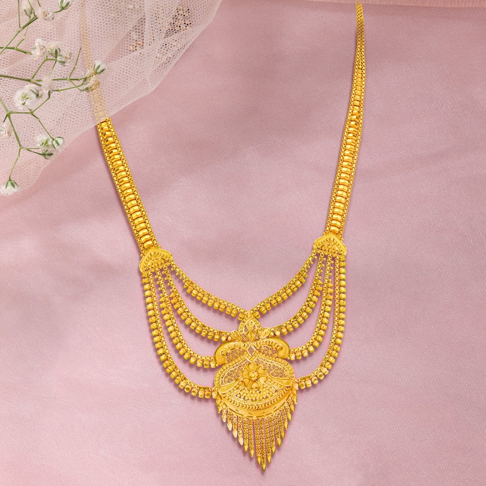 Gujarati weddings are vibrant celebrations rich with cultural significance and familial love. Each ritual – from the energetic Garba to the solemn Saptapadi – consolidates not just the union of two individuals but the bond of two families. For the traditional Gujarati bride, her attire and especially her jewellery play a crucial role in embodying beauty and heritage. Tanishq’s exquisite collections of bridal and traditional Gujarati gold jewellery designs guarantee she shines on this memorable day.