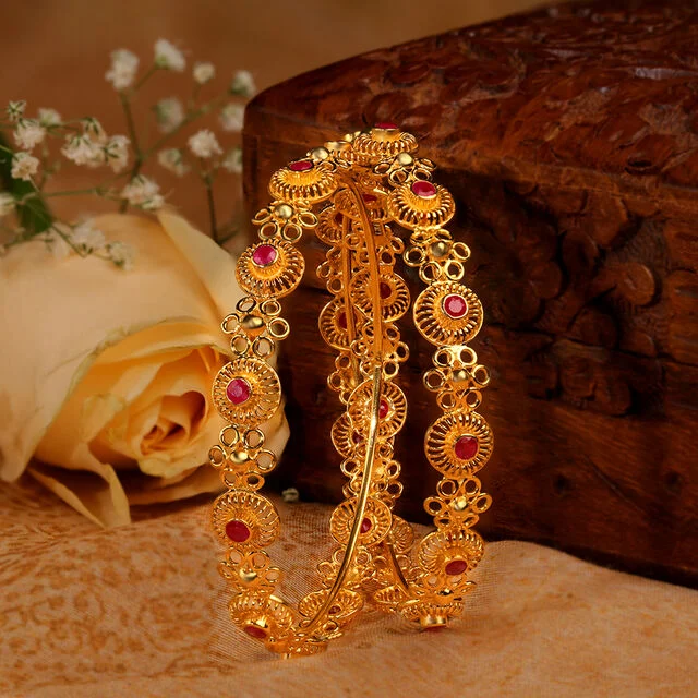 Post-ceremony, the bride dazzles in a saree or lehenga coupled with a south Indian jewellery set for wedding. Her look is finished with beautifully crafted south Indian jewellery design and Timeless Floral Bangles, and her south Indian saree jewellery complements her radiant smile.