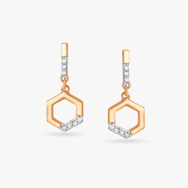 - Elevate your style with the contemporary charm of the Abstract Hexagon Diamond Drop Earrings, designed to add a modern geometric flair while showcasing the unmatched brilliance of natural diamonds.