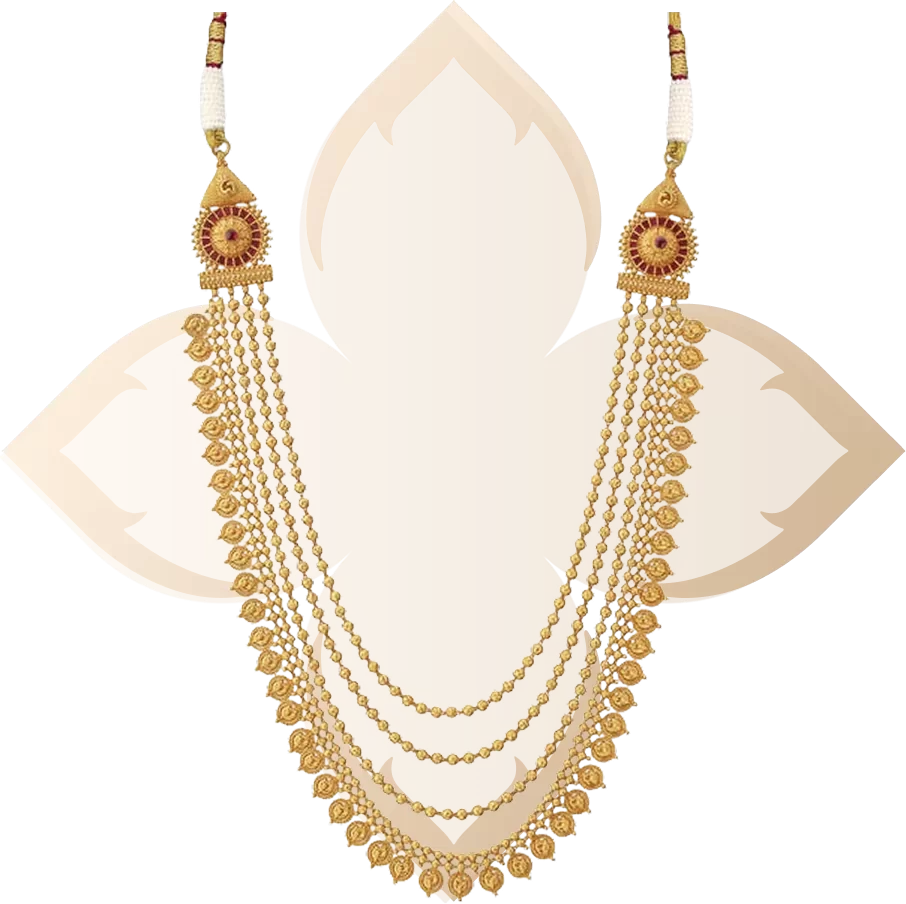 Golden waterfall cascading from the hair partition with 300+ handcrafted beads shimmering like molten sunlight, the Kolhapuri Saaj rests elegantly along the neckline but visually anchors the upper body. It is the ultimate Nauvari power symbol, making it perfect for bridal nauvari jewellery styling.