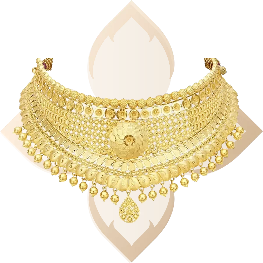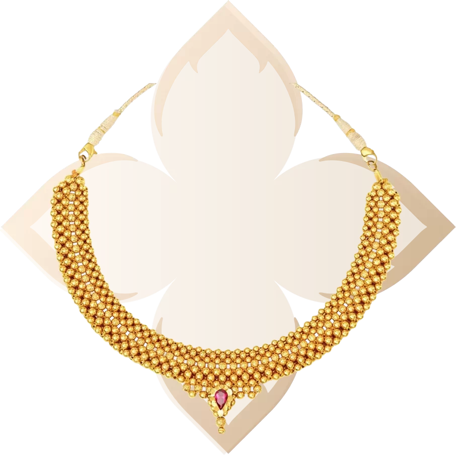 The Thushi is a close-fitting choker made of tightly strung gold beads. It is a foundational piece in any nauvari jewellery set.