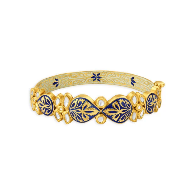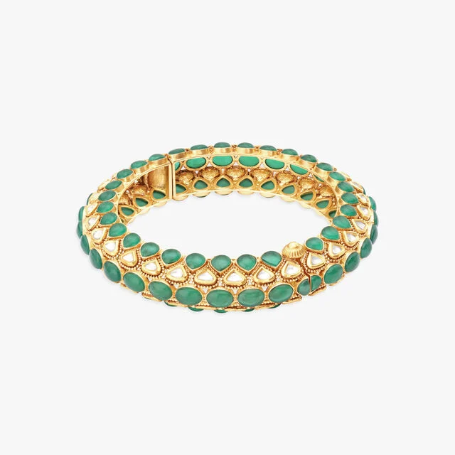 The opulent gold and Kundan Polki bangle combines the brilliance of 22k gold with detailed Kundan and Polki work, creating a dazzling effect that captures every eye. Its artistic design complements many bridal styles.