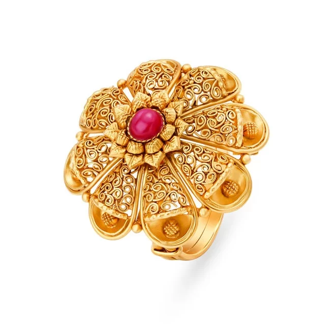 Layered necklaces in gold jewellery bring subtle layering to your haldi set for bride. The Magnificent 22 Karat Yellow Gold Decorative Floral Finger Ring complements hands beautifully. Minimalistic and lightweight finger rings can add a touch of sparkle to the bride’s hands during the Haldi ceremony. Opt for delicate haldi jewellery design featuring gemstones or choose trendy midi rings that can be stacked or worn individually. These rings provide a subtle yet significant accent to the bride’s overall new haldi jewellery look, drawing attention to her hands and enhancing her natural beauty.