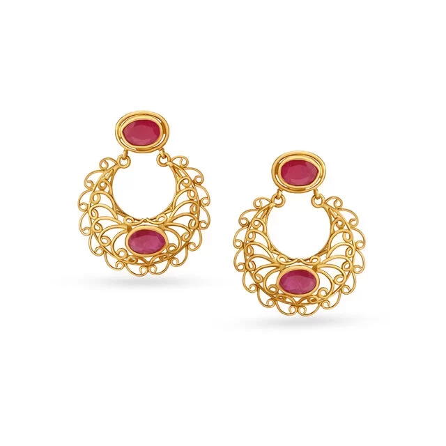 Opt for trending wedding jewellery such as statement earrings to infuse glamour and festivity into your haldi bridal jewellery set. Look for designs that incorporate colorful gemstones, beads, or shells. The Breathtaking Ruby Gold Drop Earrings add vibrant drops perfect for the occasion. Tassel earrings, with their playful and vibrant nature are perfect for adding an extra dose of joy to your appearance. Additionally, oversized jhumkas, traditional Indian earrings, can lend a touch of grandeur while still being lightweight and comfortable. Explore various haldi jewellery design and find the perfect pair that reflects your personality and style, making you stand out during the Haldi ceremony.