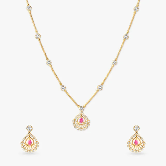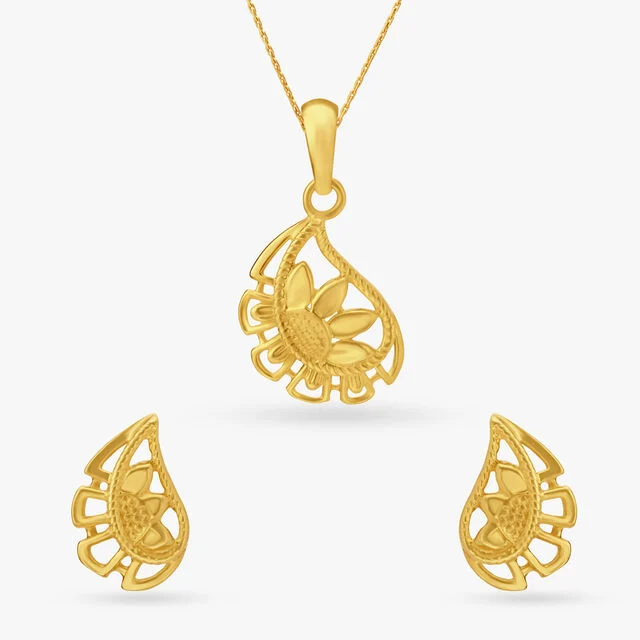 The Sunflower Pendant and Earrings Set by Tanishq exemplifies the grandeur of a perfect gold jewellery set for wedding, blending intricate design with royal elegance.