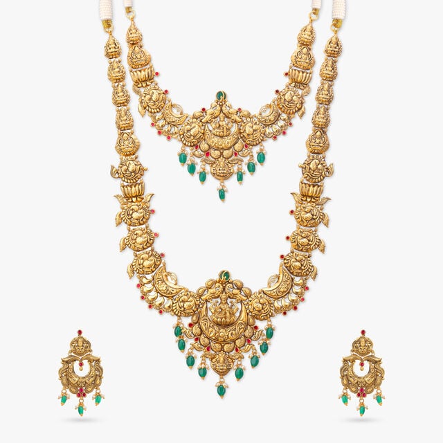 Temple jewellery like the Divine Triveni Gold Jewellery set, inspired by temple architecture and deities, adds an authentic and majestic touch to the bridal ensemble, retaining its place in traditional wedding jewellery sets.
