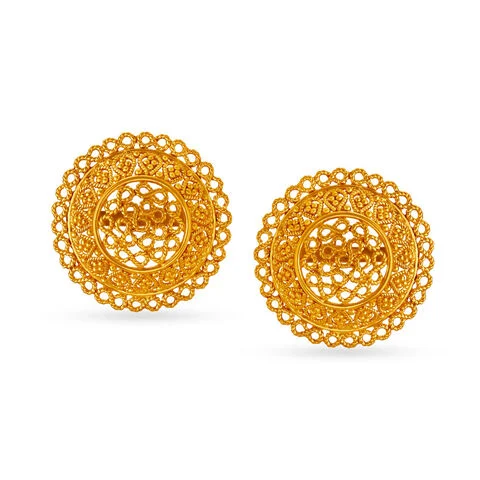 This piece of Indian wedding jewellery is a must for all brides. After all, it adds so much grace and elegance to her look. She could opt for intricate jhumkas or go for something more contemporary, either in diamond or gold. There are plenty of earrings for Indian weddings available today.The Pristine and Charming Jali Work Circle Stud Earrings are a striking option for brides seeking elegant and versatile wedding earrings gold.