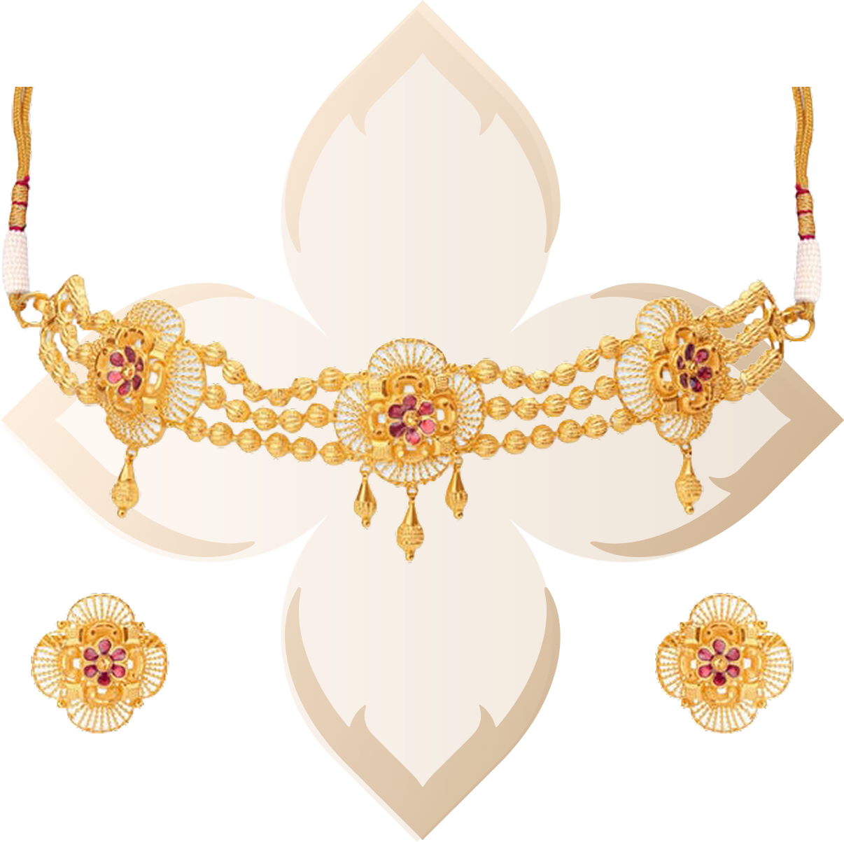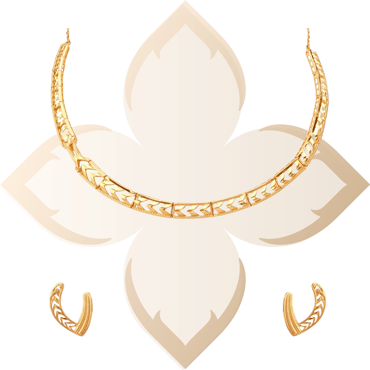 A clean line with soft detailing that sits just right on the collarbone, this gold necklace set for women looks polished on saree days and with a brocade blouse.