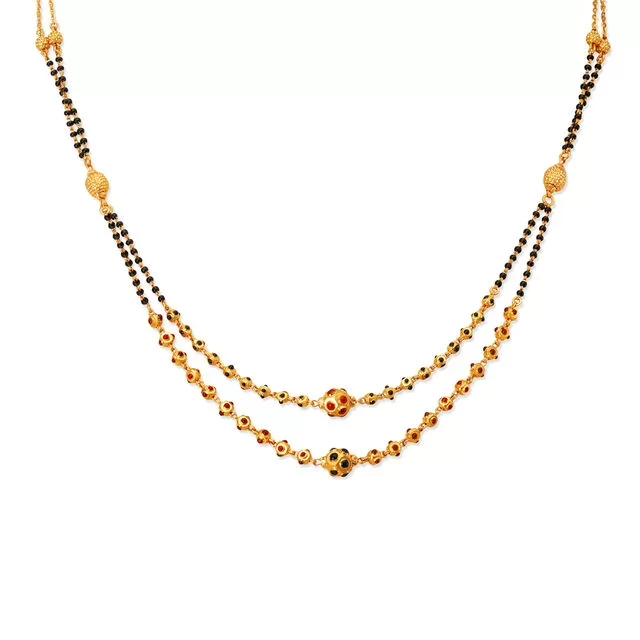 A traditional Indian wedding is always celebrated with a mesmerising gold Mangalsutra, and it makes a religious ornament for many Indian women and symbolises emotions and sacredness. Long gold and black beaded 22 Karat Mangalsutra with multiple layers blend well with your lovely fancy saree, the delightfully traditional Kanjeevaram, and the Banarsi outfit. You can wear this design daily or for special occasions like weddings, housewarmings, or any other event.