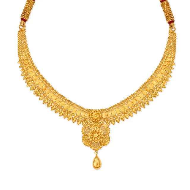 However, a lightweight traditional gold necklace set goes well with formal attire for office presentations and parties and traditional attire for occasions like poojas, functions, weddings, and other celebrations. With Tanishq, find some attractive Indian gold jewellery designs for your next office party.
