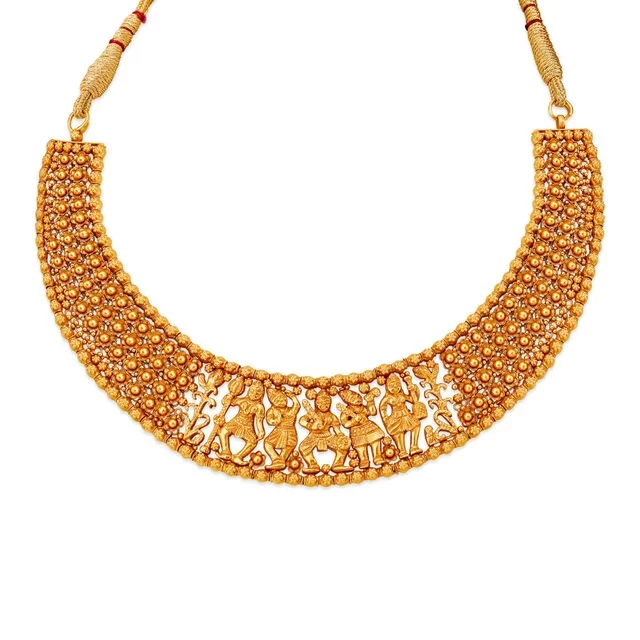 The auspicious and divine Temple jewellery makes an essential accessory that a South Indian bride receives to enhance her look and invoke an element of divinity on her wedding day. Temple ornaments have figures and patterns of gods, goddesses, flowers and elements carved in temples. The stunning 22-karat yellow gold choker necklace featuring carved figurines has its traditional charm by Tanishq and blesses you with the conventional richness and blessings of gods for a new beginning.