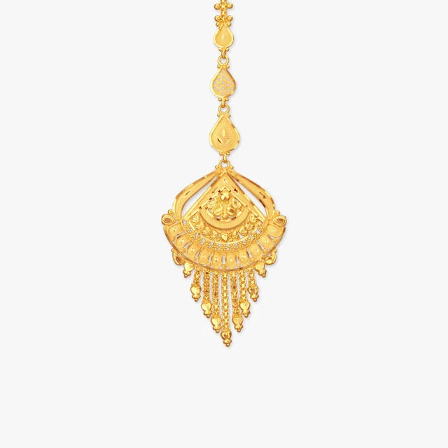 The Traditional Gold Maang Tikka from Tanishq is crafted with intricate designs that bring a regal touch to your bridal look, perfectly blending tradition and elegance.