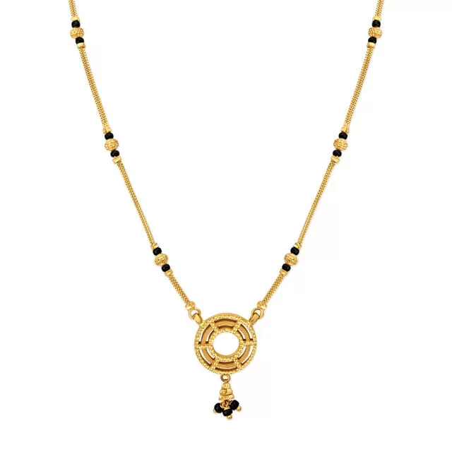 Classic variations of gold mangalsutra designs usually use black beads for warding off negativity, strung on a delicate gold wire with a central deity in the pendant.